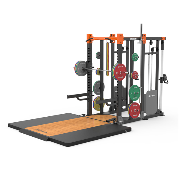 舒华高端综合框式力量训练器SH-G8903功能区:杠铃片整组挂架、万向炮筒、举重杆保护架、单杠架、双杠架、大飞鸟功能。