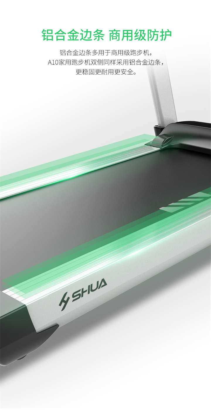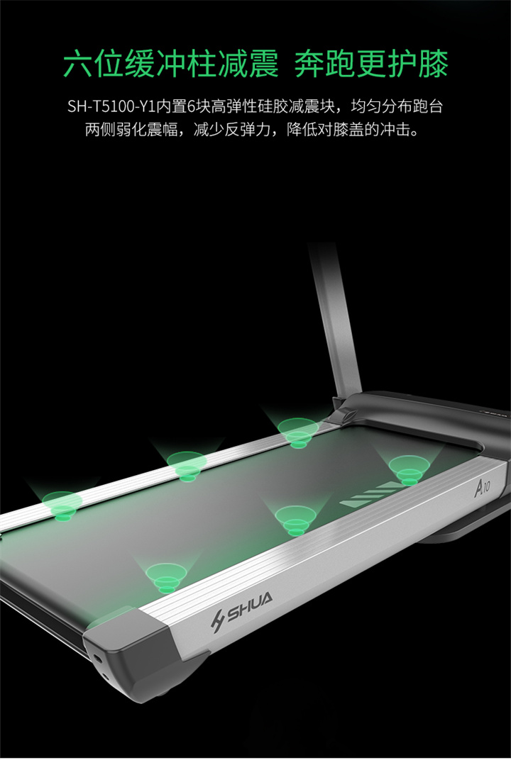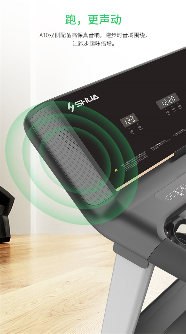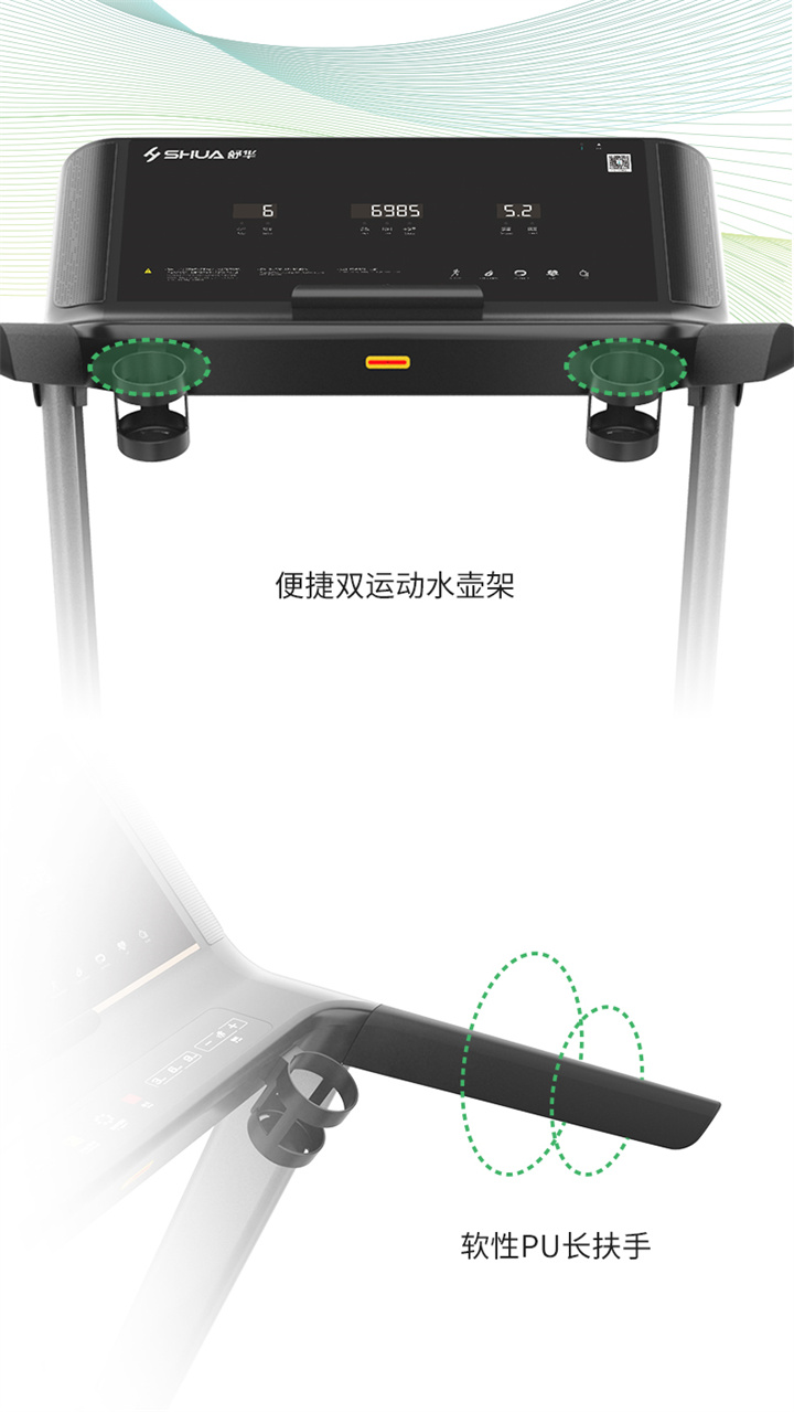 锐强体育推荐健身器材-舒华商用电动跑步机SH-T6500拥有10.1寸IPS高清触摸屏、Z型动感时尚外观设计、70×150mm精钢立柱机身、F级高效静音马达、520mm商用豪华跑带和35mm双层全跑台减震跑板等优势,让您享受科学跑步。