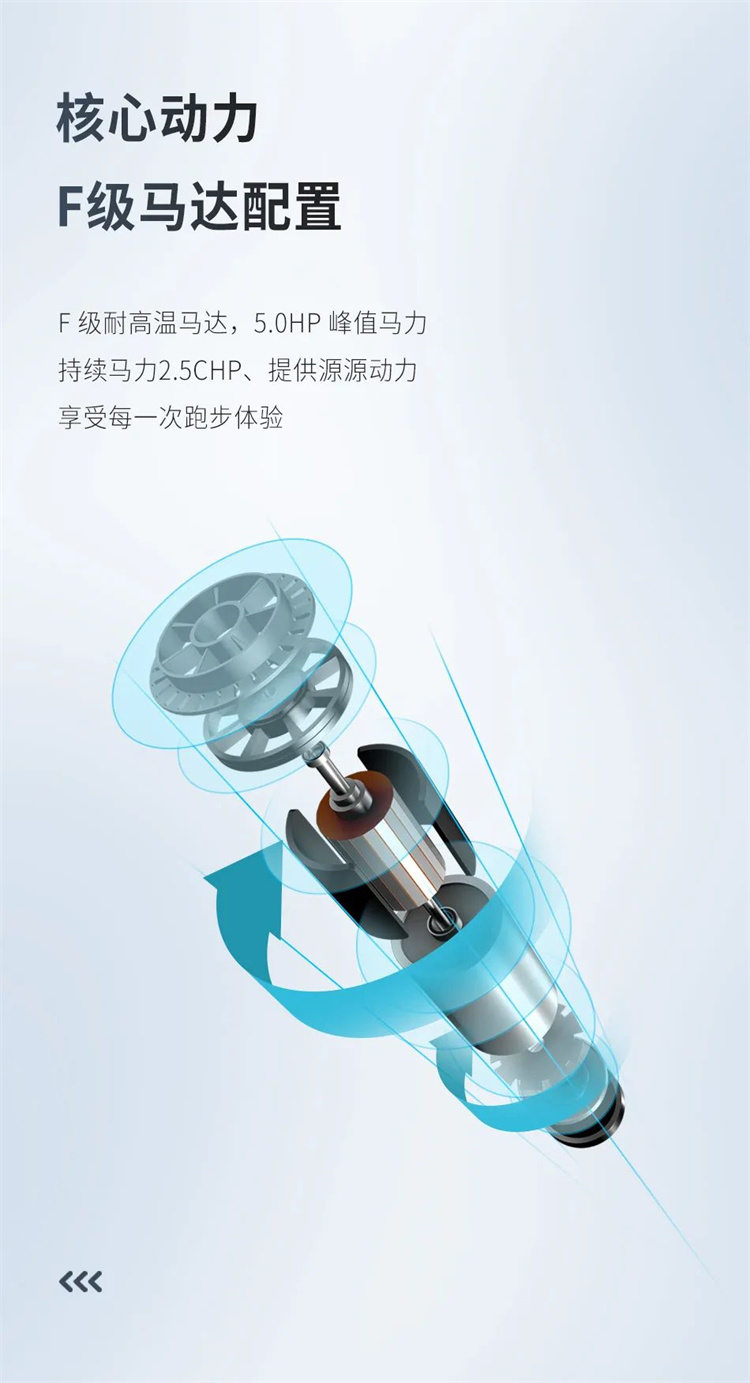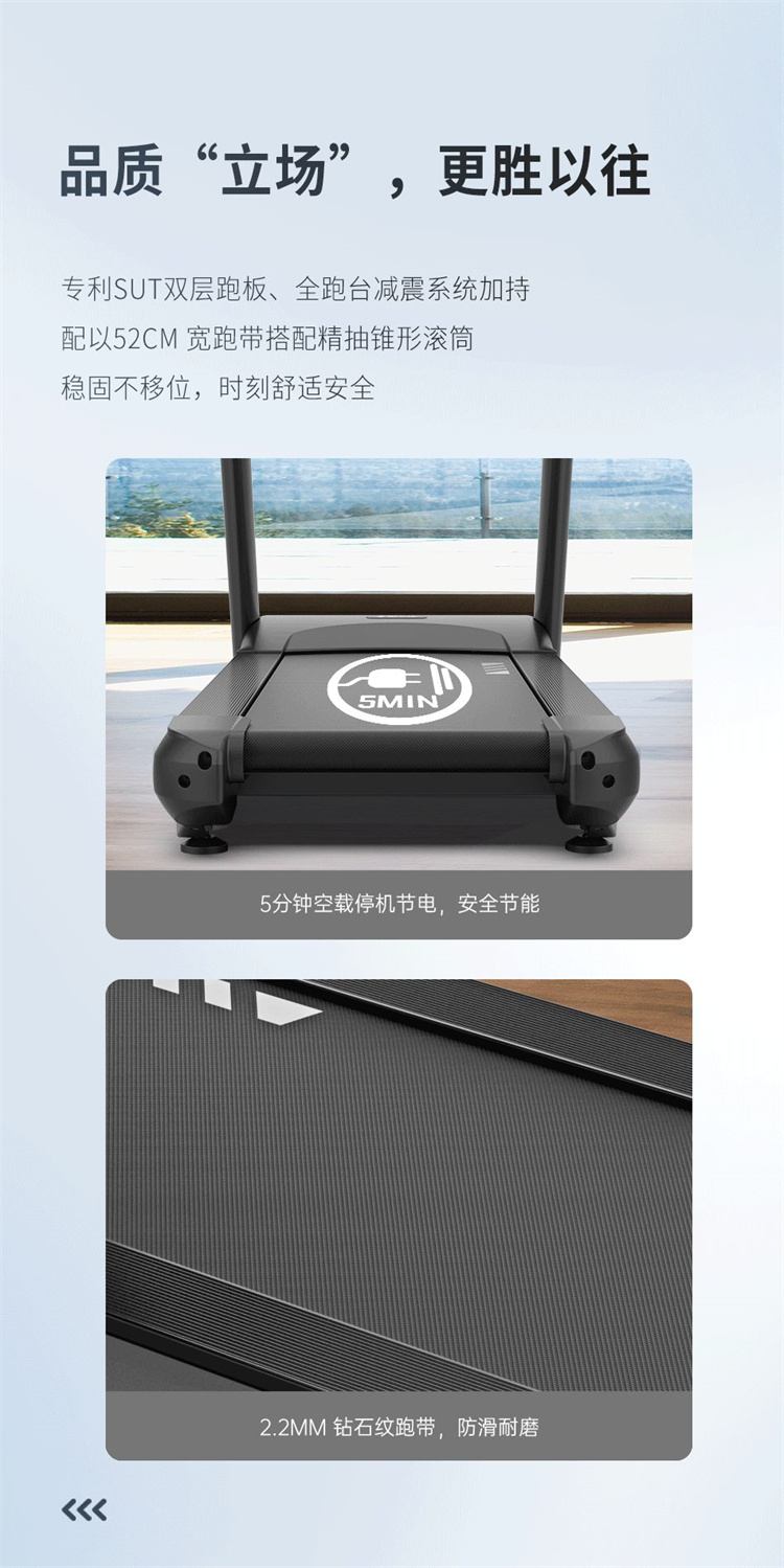haobotiyuSH-T5100持续马力达1.25HP,具有500×1350mm的跑台,运用无线心率接收模块监测心率,运用6位硅胶减震设计,最大承重是126kg,可以满足大多数家庭的使用。